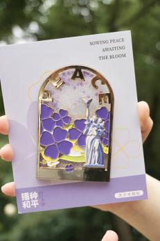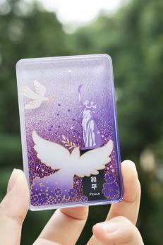 融合紫金草、和平鸽及《和平》雕塑,和平鸽飞翔环绕于雕塑之上。《和平》雕塑采用简约而庄重的线条及阴影勾勒,展现出宁静而坚韧的力量。当冰箱贴轻轻晃动时,流沙缓缓流动摇曳,营造出平和、安宁的氛围。