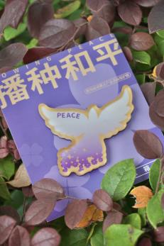 展翅飞翔的和平鸽,尾羽融合了轻盈飘落的紫金草花瓣,象征着和平鸽在飞翔途中不断撒播和平与希望的种子。