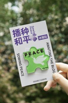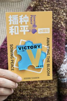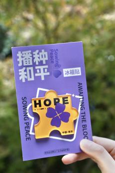以代表希望的紫金草、象征和平的和平鸽、寓意胜利的字母V组合成3款拼图冰箱贴,拼图的造型可进行自由组合搭配。冰箱贴采用高品质透明亚克力材料,激光切割技术,边缘圆润,手感细腻。