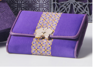 小钱包面料为电脑提花工艺,装饰纹样、配色与“紫金草国际和平纪念章绶带”一致,皮质包镶。