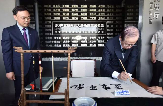 After the visit, Yasuo Fukuda went to the shrine, laying a wreath and writing “I deeply mourn for the victims of the Nanjing Massacre, written by Yasuo Fukuda, former Japanese prime minister” on the white couplet. Afterward, he arranged the couplet with hands gently and led his delegation to stand in silent tribute for a long time. Finally, Yasuo Fukuda walked to the desk in front of the meditation hall, inscribed the words “Peace in East Asia” with brush, and received the history book and peace badge presented by Zhang Jianjun, curator of the Memorial Hall.