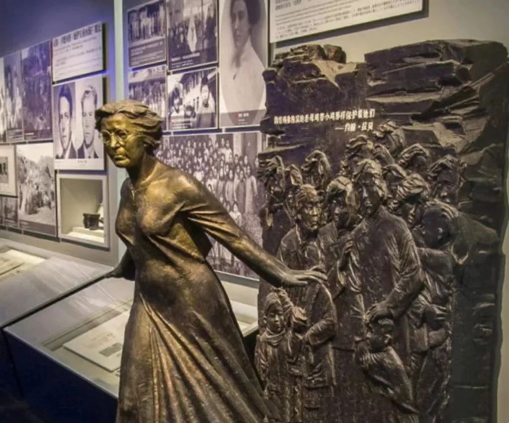 Standing in the historical material exhibition hall of the Memorial Hall is a bronze statue of Minnie Vautrin, showing her as stretching her arms to protect the terrified Chinese women and children behind her. Engraved above the bronze statue is a quote from the German friend John Rabe, chairman of the International Committee of the Nanjing Safety Zone at the time: “Minnie Vautrin protects them (refugees) like an old brooding hen protecting chicks!”