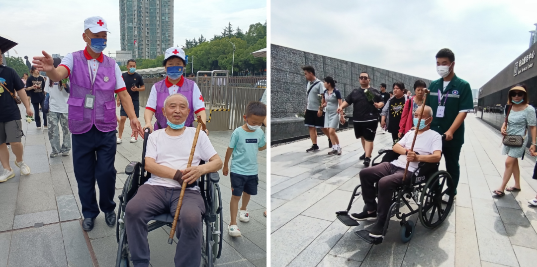 Yu Lulin is an old man having difficulty in walking. With the help of volunteers including Zhao Lin and Jiang Lingye, Yu was offered a wheelchair and entered the Memorial Hall through the green channel, with no reservation required. Then, other volunteers helped take him to the exhibition hall. “Originally I thought my physical condition would make the visit hard. But your services are so nice. I’m very touched!” he said.