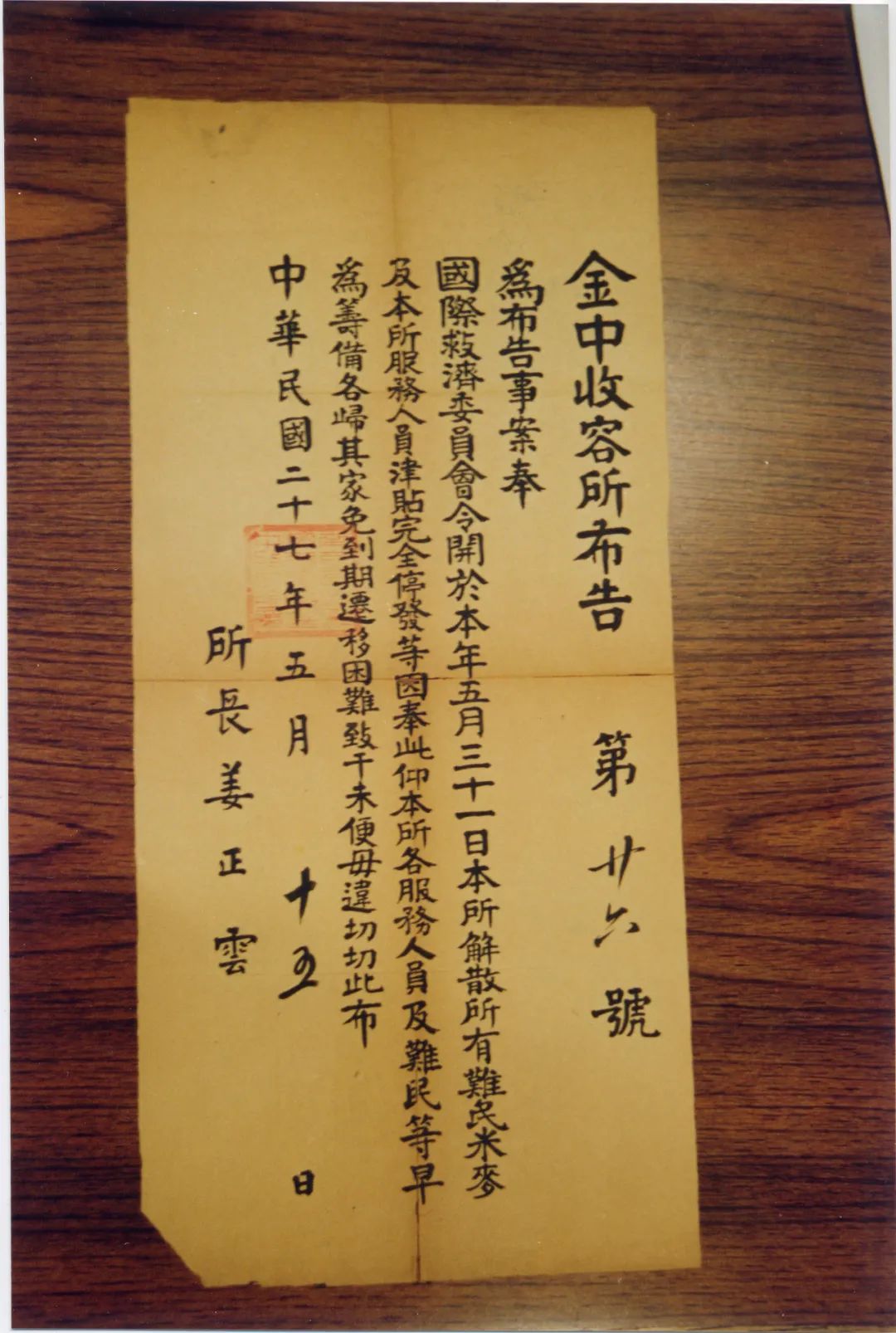 On May 15, 1938, Jiang wrote the Notice of High School Affiliated to Jinling University Refugee Camp No. 26, announcing the decision to dissolve the refugee camp as required by the International Relief Committee for the Nanking Safety Zone.