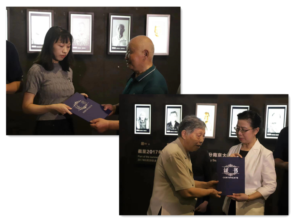 Survivors Liu Minsheng (upper) and Fang Suxia give the certificate to inheritors of the historical memories