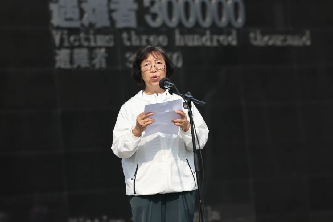 After the flag-raising ceremony, Yu Huiru, daughter of Nanjing Massacre survivor Yu Changxiang, made a speech as a representative of survivors’ descendants. “In 1937, my father Yu Changxiang was only 11 years old. His biological father Yu Bifu was captured by Japanese soldiers who forced him to work as a carrier. Later he was killed at Xiaoshikou outside the Zhonghua Gate. His foster father was shot two times and stabbed seven times by Japanese soldiers, but luckily survived. Before his death, my father said he wished the historical tragedy will never be repeated and the future generations could live in peace forever. As his daughter, I surely have a greater responsibility and obligation to play a part in safeguarding peace,” Yu said.