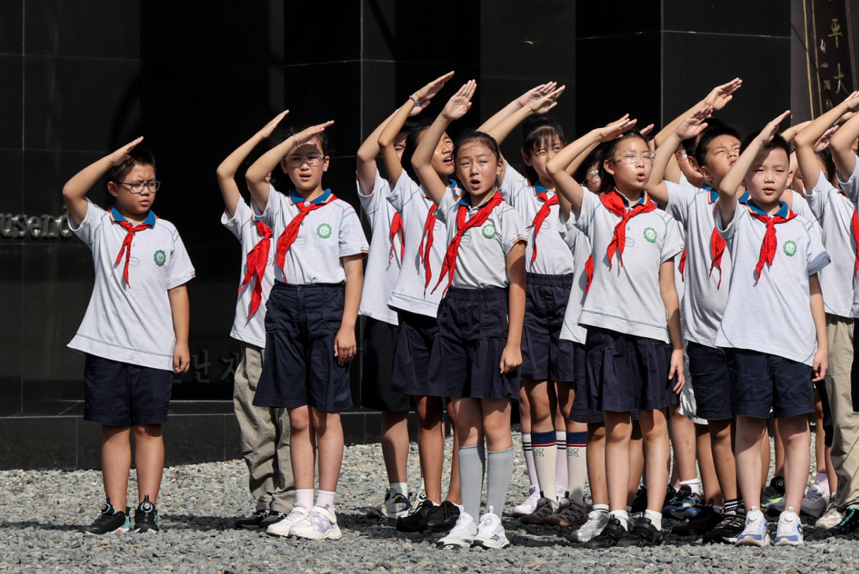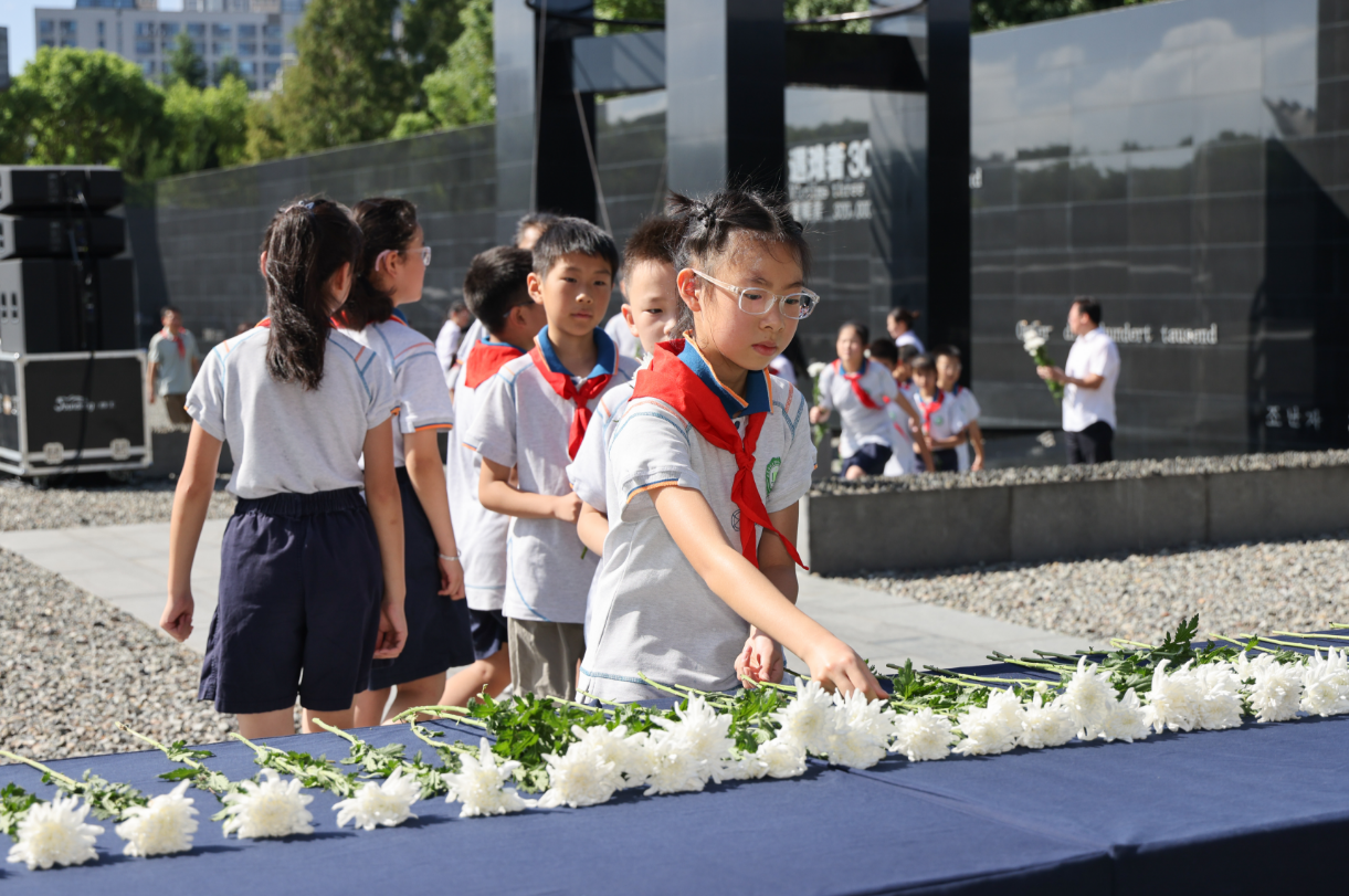 After the anthem, everyone observed a moment of silence in honor of the victims of the Nanjing Massacre, those who perished at the hands of Japanese invaders, revolutionary martyrs, national heroes, and international allies who fought alongside the Chinese people.