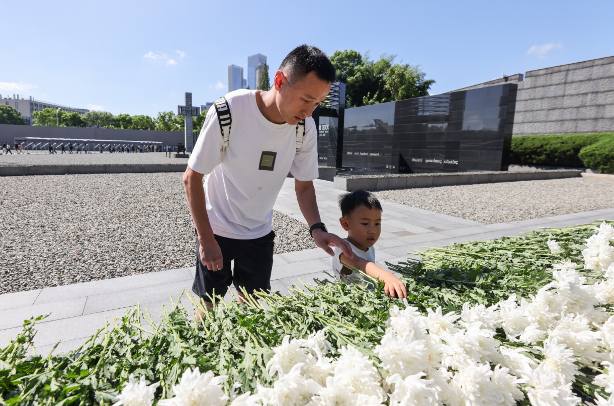"Why did the siren just go off?" asked 3-year-old Wang Zihong to his father nearby. "Because we must remember the suffering our country endured," Mr. Wang replied. He and his family traveled from Hohhot, Inner Mongolia, specifically to visit the Memorial Hall today. He remarked, "Although my child is young, he can understand some historical photos in the exhibition, and we explain them to him. I hope he remembers this day."