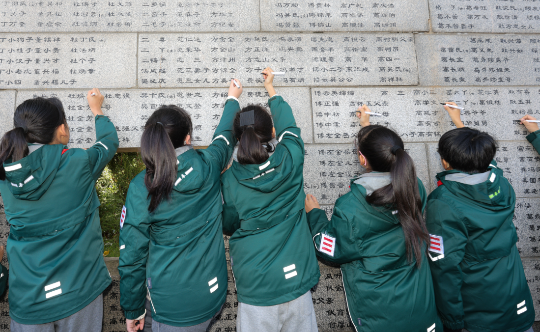 An increasing number of young people have voluntarily taken on the role of historical memory inheritors. Representatives of survivors' descendants, students, and others participated in “re-engraving” the names on the Wall of the Name List of the Nanjing Massacre Victims, an act of mourning and remembrance.