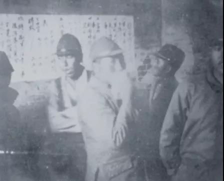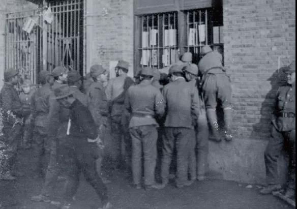 一队日本士兵在慰安所外等候,身后的墙上挂有慰安所规定