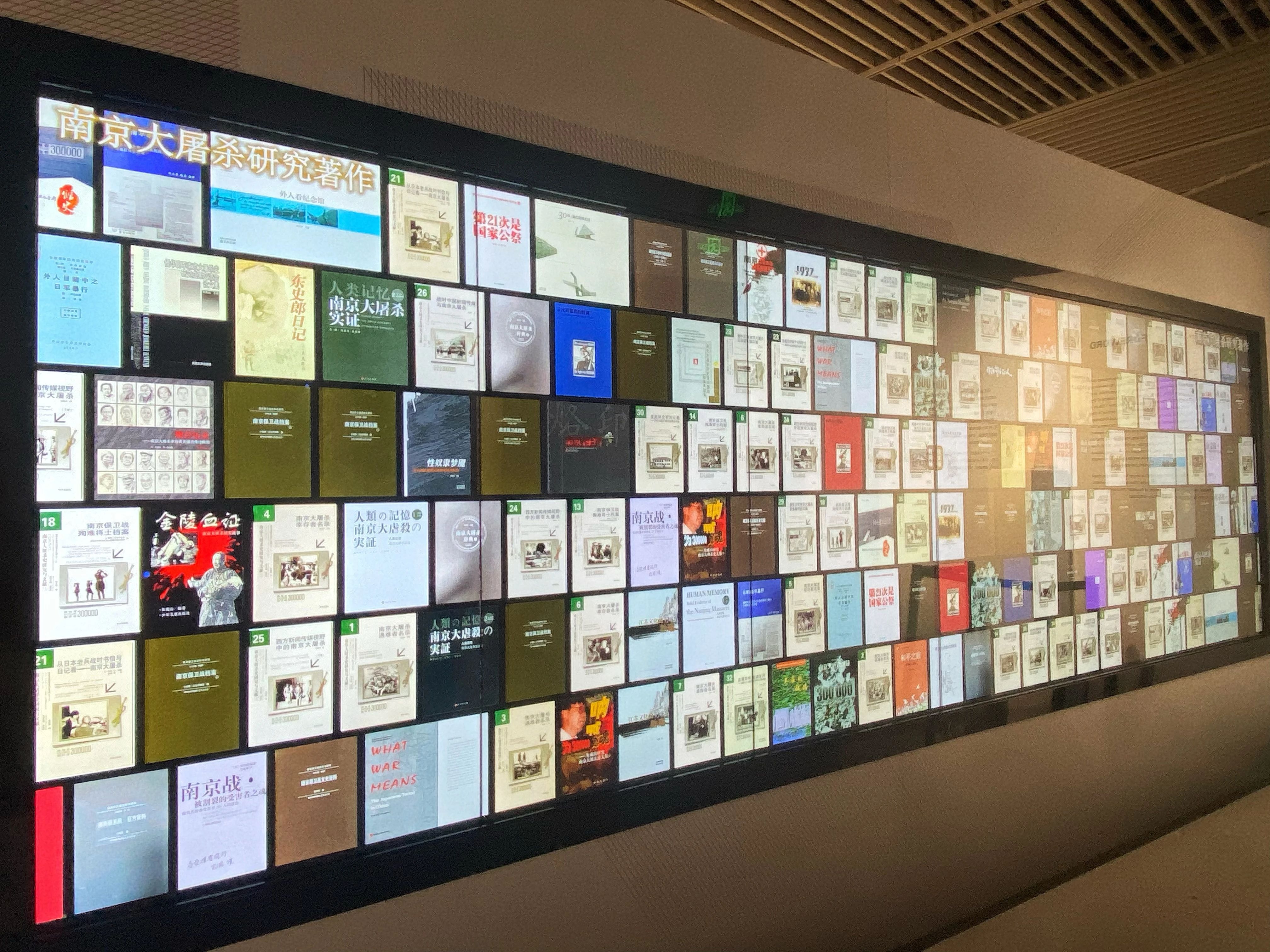在展览入口设置了数字触屏,多人同时操作互不干扰,观众点击大屏,与文献“对话”。电子文献是展览的一大亮点,以时间轴的形式呈现1937年至今的100多件代表性文献,收录了110多部著作和100多篇国家记忆与国际和平研究院的专家论文。