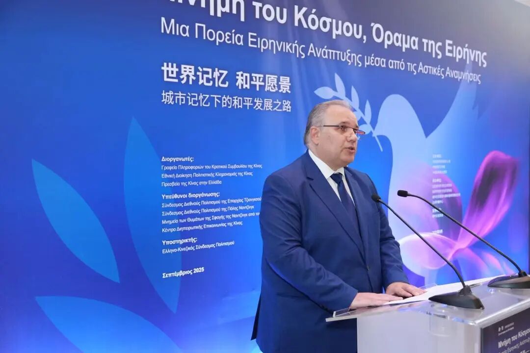 中国驻希腊大使方遒在致辞中表示:“此次展览不仅是南京与雅典两座城市的交流互动,更是中希两大古老文明跨越山海的深情对话。我们愿同希方一道,坚持弘扬正确二战史观,坚定维护二战胜利成果,让推进全球治理体系变革、推动构建人类命运共同体的成果,更多更好造福全人类。”