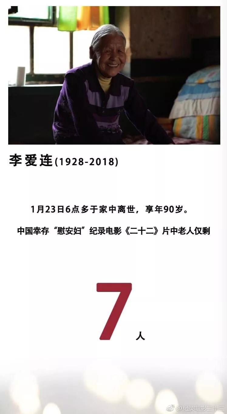 还记得去年8月14日公映的国内首部获得公映许可资格的“慰安妇”题材纪录片《二十二》吗?其中有位爱猫老人李爱连,于昨天早晨6点左右,在家中离世,享年90岁。至此,中国大陆登记在册的“慰安妇”幸存者不足15人,而在纪录片《二十二》中,健在的“慰安妇”幸存者仅剩7人。