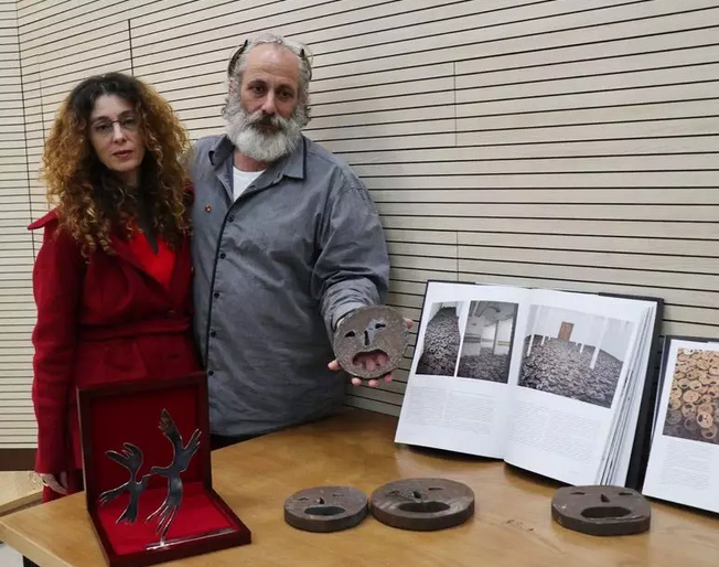 今天是“国际大屠杀纪念日”。昨天,以色列艺术家玛纳什·卡迪诗曼(已故)的儿子本·卡迪诗曼及夫人专程赶到南京,将其父亲生前创作的“秋之落叶”装置艺术中的四枚“金属脸”雕塑,以及“和平之吻”雕塑捐赠给侵华日军南京大屠杀遇难同胞纪念馆。