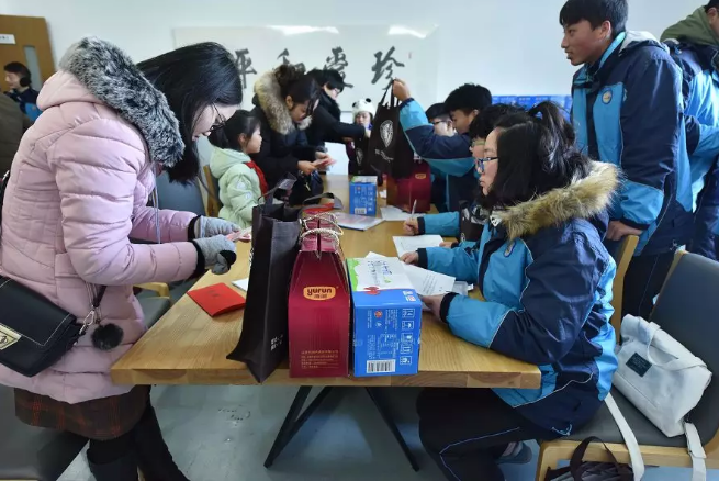 南京商业学校的志愿者(身着蓝色校服)协助南京侵华日军受害者援助协会工作人员发放慰问物资