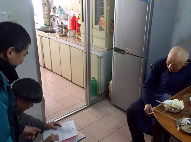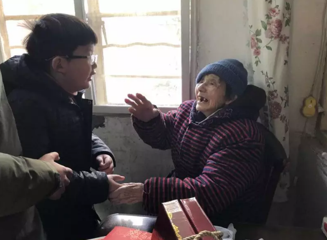 监狱民警沈荣华带着孩子慰问马月华老人,老人拉着孩子的手说:“你一定要珍惜现在的美好生活!”