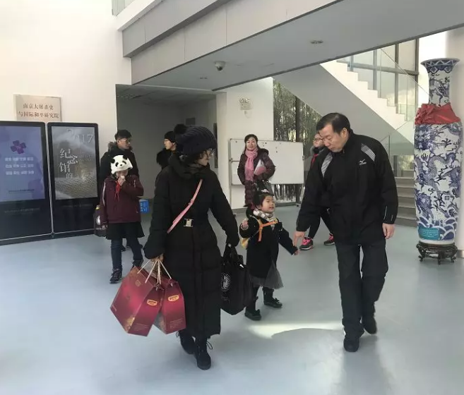 54岁的阿公、阿婆牵着3岁的小女孩刘芯圩去慰问幸存者,阿婆说:“跟她说南京大屠杀期间有很多孩子被杀害,她哭得很伤心。跟她说幸存者老人,她也懂。”