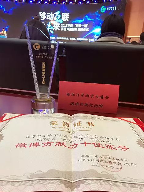 昨天下午,2017年度“两微一端”百佳评选榜单揭晓仪式、江苏力量——2018腾讯区域影响力峰会分别在北京和南京举行。侵华日军南京大屠杀遇难同胞纪念馆获评2017年度“两微一端”百佳评选微博贡献力十佳账号、2017江苏政务新媒体传播创新奖。