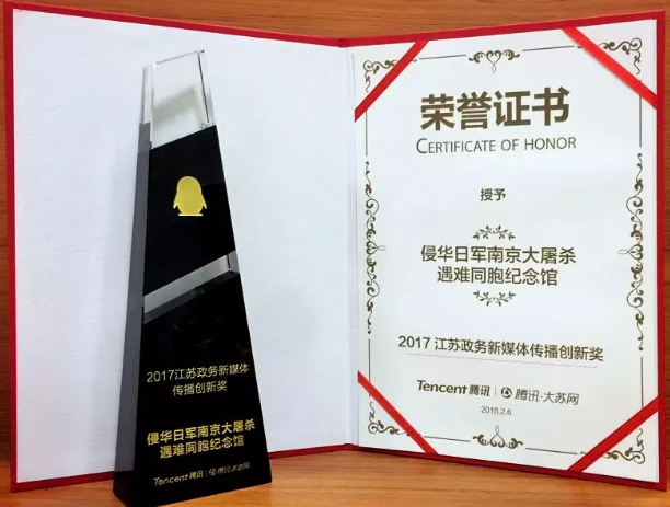 同一天,由腾讯公司主办、腾讯·大苏网承办的“江苏力量——2018腾讯区域影响力峰会”在南京国际博览会议中心钟山厅举行。会上,纪念馆获颁“2017江苏政务新媒体传播创新奖”。