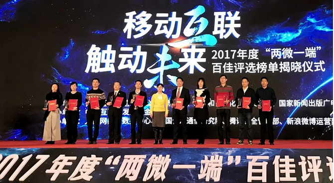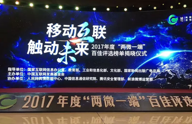 昨天下午,2017年度“两微一端”百佳评选榜单揭晓仪式在人民日报社举行。评选活动由国家互联网信息办公室、教育部、工业和信息化部、文化部、国家新闻出版广电总局联合指导,中国互联网发展基金会主办,人民网舆情数据中心、中国信息通信研究院、腾讯安全管理部、新浪微博运营部协办。中国互联网发展基金会理事长马利、国家互联网信息办公室移动网络管理局局长方楠等出席并致辞。