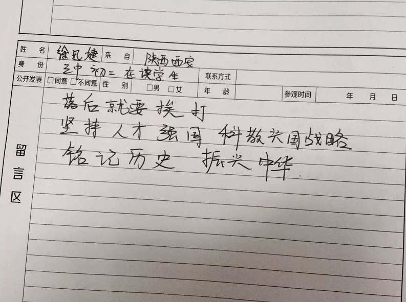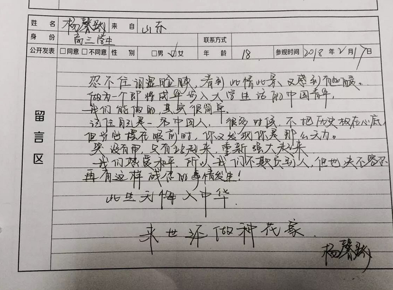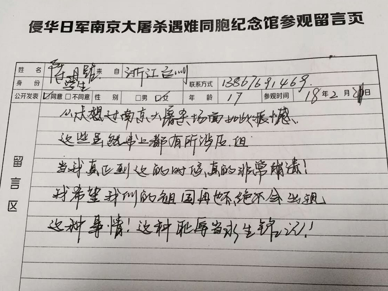 来自扬州的高先生夫妇特意赶在假期结束前,带着11岁的儿子来到纪念馆参观。他们还在史料陈列厅的留言屏幕上手写留言:“勿忘国耻,愿我们的祖国越来越强大!”高先生说,儿子还小,正是树立世界观、价值观和人生观的时候,“我带他来了解这段历史,让他记住当年祖国落后,日本发动了侵华战争,杀了我们很多无辜的百姓。现在身在和平年代,要好好学习,将来为祖国更加强盛,尽自己的一份力。”