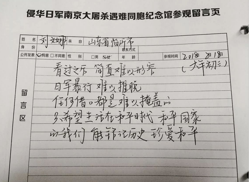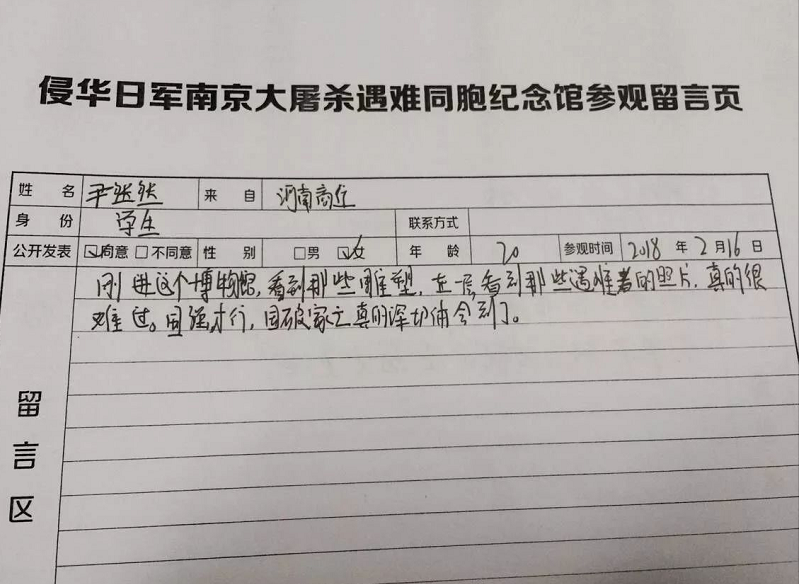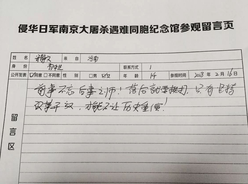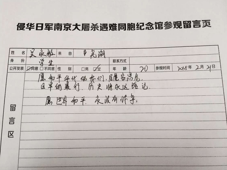 和高先生父子一样,很多观众在参观结束后,都会在纪念馆的留言簿上签名留言。“铭记历史”、“愿世界和平”是大家写的最多的字眼。