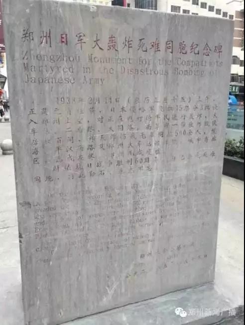 假如你到过郑州,在钱塘路和大同路交叉口,有一块“郑州日军大轰炸死难同胞纪念碑”十分醒目。碑的背面刻着:1938年2月14日,日军对此处平民进行轰炸,炸死炸伤我无辜同胞500余人……特此勒石,永志不忘。