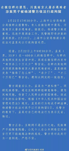2018 年2月23日,上海市公安局杨浦分局对在微信群谩骂、污蔑南京大屠杀遇难者的涉事男子孟某(35岁)处以行政拘留处罚。警方通报如下: