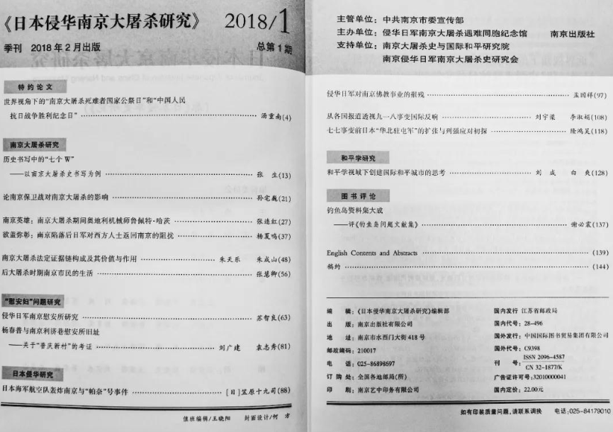 日前,《日本侵华南京大屠杀研究》正式创刊。该刊是面向国内外公开发行的学术期刊(季刊),主管单位为中共南京市委宣传部,主办单位为侵华日军南京大屠杀遇难同胞纪念馆、南京出版社有限公司,支持单位为南京大屠杀史与国际和平研究院、南京侵华日军南京大屠杀史研究会。《日本侵华南京大屠杀研究》的创办填补了国内外专门研究南京大屠杀史和日本侵华史的史学类学术期刊空白。