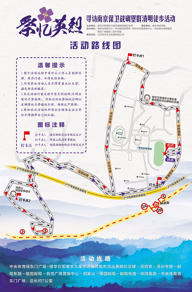 活动特邀南京保卫战研究专家,在起点讲解南京保卫战碉堡群情况,带领大家重读历史;在侵华日军南京大屠杀遇难同胞东郊丛葬地纪念碑处献花并播撒“和平之花”紫金草种子。此次活动还设计了“紫金草”和平护照,在陵东路与灵谷寺路交叉口、邵家山民国军事遗址、体院南路与西洼子路交叉口三个印章加盖地点集齐三枚印章,即可在终点领取纪念奖牌一枚。