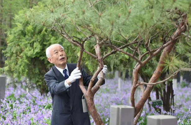 3月30日8:30,日本悼念南京大屠杀遇难者植树访华团事务局长秋本芳昭先生独自一人来到纪念馆,在和平广场西南角的紫金草花园里,为他和团员们曾经种植的千头松修剪枝叶。