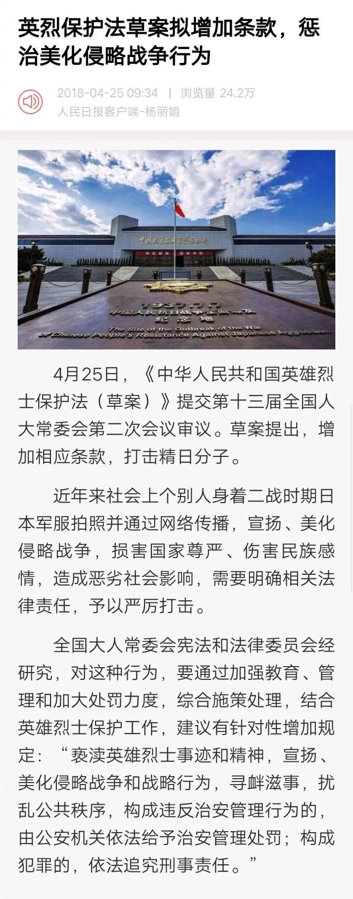 此次《中华人民共和国英雄烈士保护法(草案)》提交第十三届全国人大常委会第二次会议审议,通过完善法律,为此类违法行为划上一道明确的底线,鼓舞人心!