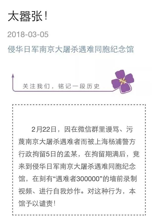 2月22日,在上海发生35岁男子孟某在微信群谩骂、污蔑南京大屠杀遇难者事件。孟某被上海杨浦警方行政拘留5日,拘留期满后,于3月3日来到纪念馆,在刻有“遇难者300000”的墙前录制视频,进行自我炒作。纪念馆于3月5日、8日、9日接连通过官方微博、微信发声。