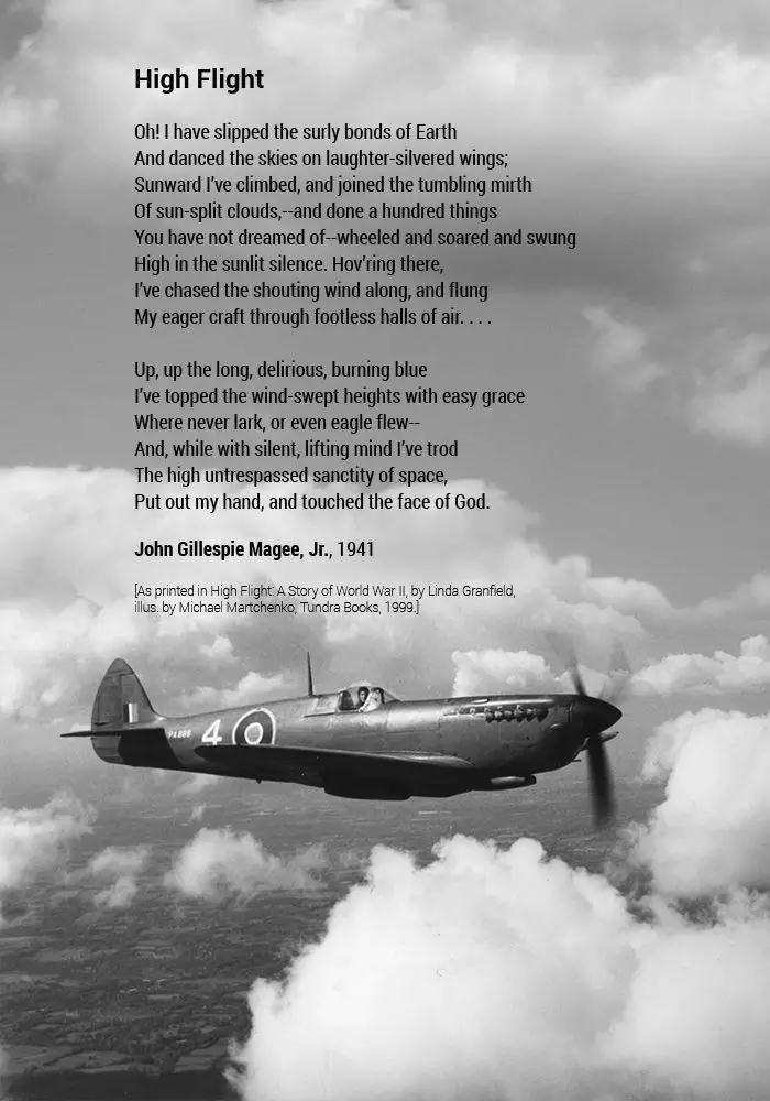 这首诗是约翰·吉利斯比·马吉于1941年在英国上空驾驶战机抗击纳粹时写下的,在二战后70多年来,它激励了无数飞行员和宇航员。他的父亲约翰·马吉在南京大屠杀期间参与救助南京难民和受伤的中国军人,并用摄像机秘密拍摄日军暴行。