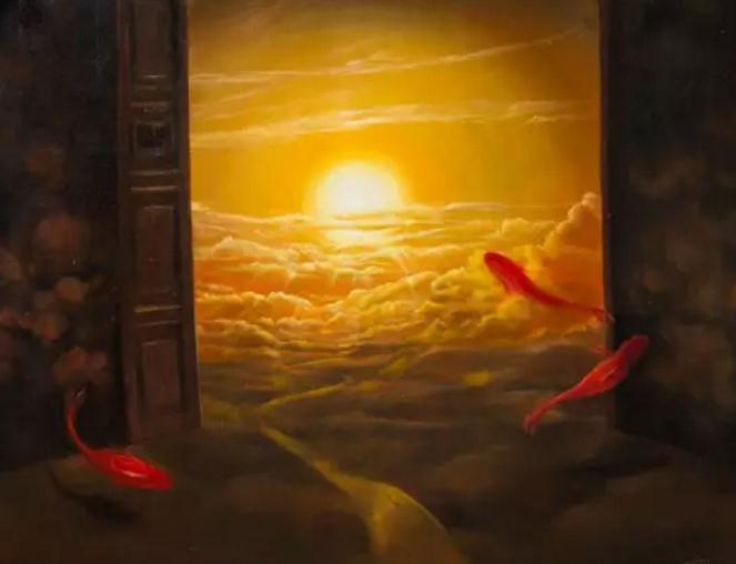 南京青年艺术家肖婷钰根据电影《云上日出》的情节创作了12幅主题系列油画,这是国内为数不多地将油画与电影两种艺术形式结合的创新作品。她以影片中的元素如鸟、鱼、花为基础进行再创作,用油画讲述孩子在战争年代遭受的苦难、离别和生死。