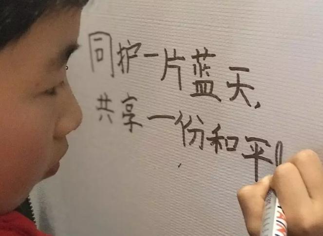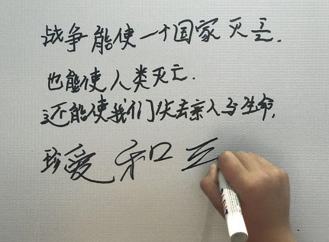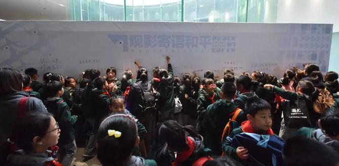 观影结束后,孩子们观看展览,并写下和平寄语。