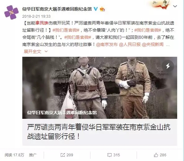 2018年年初南京紫金山碉堡“精日”事件中,纪念馆微博第一时间发文怒斥。