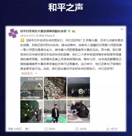 2016年4月15日,日本熊本县发生地震。熊本师团曾是参与南京大屠杀的元凶之一,但熊本县同样也是日中友好协会的所在地。我们的官方微博立刻发文“日中友好协会的朋友们,你们还好吗?”。