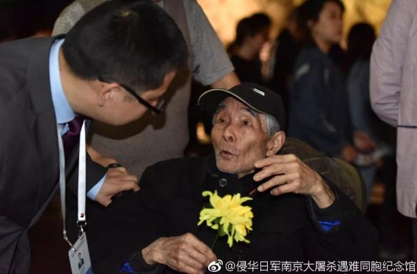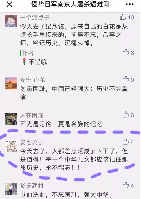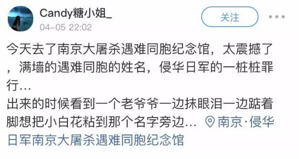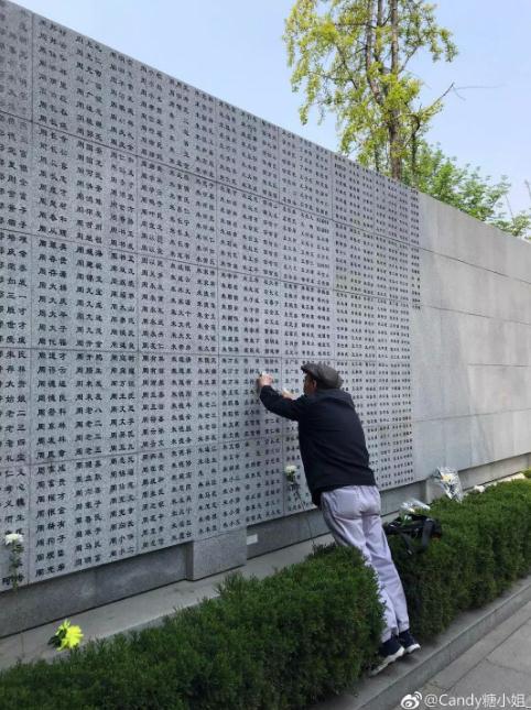 同在5日,网友@CAndy糖小姐_来到纪念馆参观,在经过遇难者名单墙时,她看到“一个老爷爷一边抹眼泪一边踮着脚想把小白花粘到那个名字旁边”,她用手中相机记录下这一瞬间并发到自己的微博上。这张照片同样也感动了我们:
