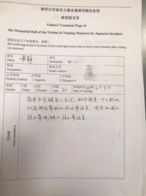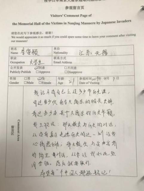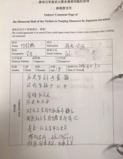 许多观众参观完《南京大屠杀史实展》后,在尾厅留言簿上留下笔墨。这些滚烫的留言,力透纸背: