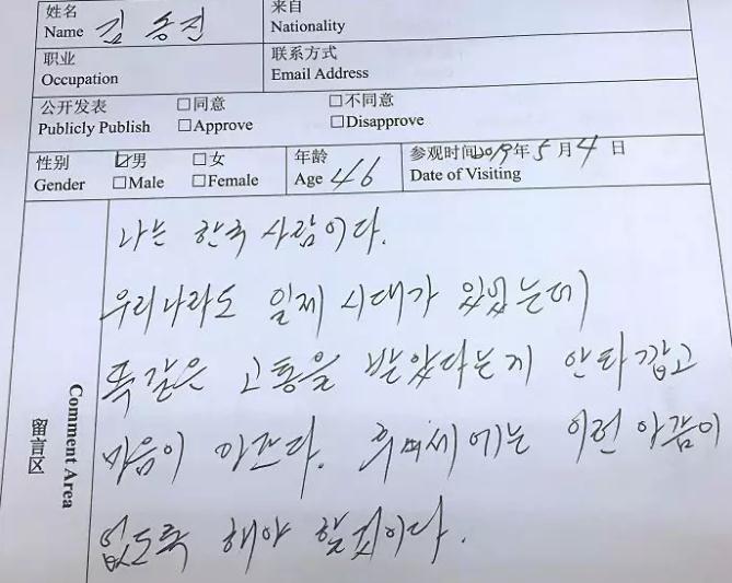 我是韩国人,我们国家也曾被日军占领,遭受过很多苦难,我心情真的很沉重。希望今后不再发生这样的事。