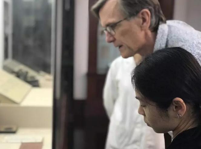 约翰·马吉的两个孙子在祖父的事迹展陈前交流