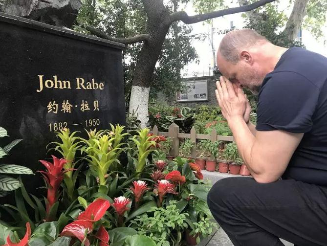 拉贝先生的曾外孙克里斯托弗·莱因哈特双眼噙满泪水,久久跪在拉贝铜像前。