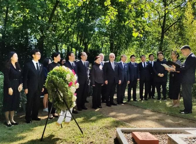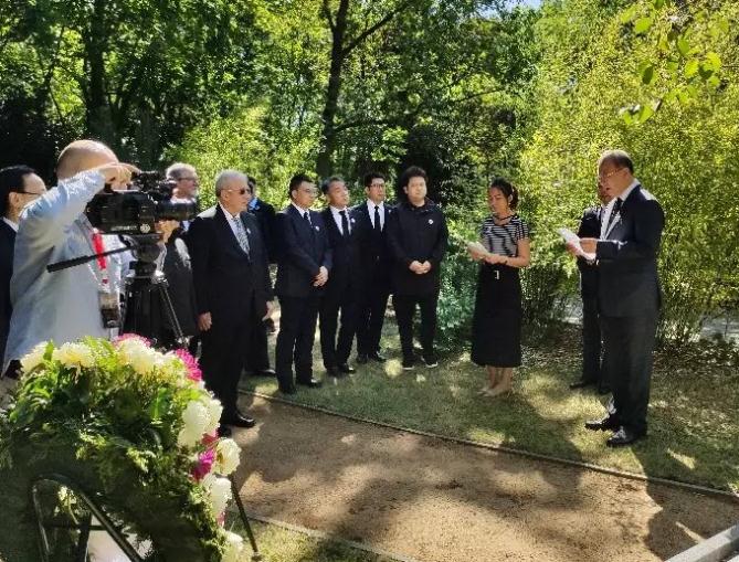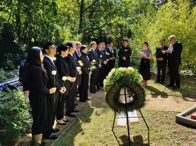 柏林时间7月4日上午,江苏省委常委、宣传部部长王燕文,南京市委常委、宣传部部长陈勇,以及江苏省文化代表团、歌剧《拉贝日记》剧组代表,怀着感恩之心,前往拜谒约翰·拉贝先生墓地。约翰·拉贝的孙子托马·拉贝先生以及拉贝研究会人士一同前往。我馆副馆长凌曦也参加了凭吊。