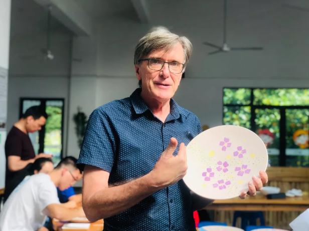 上午,在高淳陶瓷博物馆,国际友人后代饶有兴致地跟随世界折纸大师及设计师裴浩正学习折纸技艺:用一张完整的纸,在没有任何裁剪的情况下,折出象征和平的“紫金草”作品。