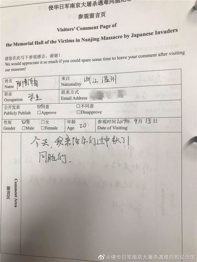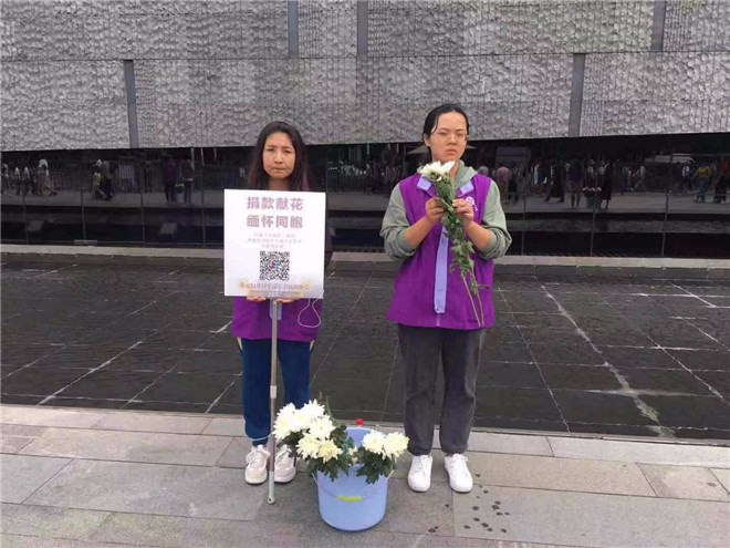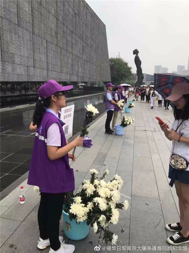 陈雪梅说,很多观众进馆后,都要带枝花献给遇难同胞和南京保卫战守城将士,“中秋节那天下午,我走到史料陈列厅里面南京保卫战部分殉国将士名录前,看到有几位四十多岁的阿姨在那里默哀,她们还跟名单墙上的将士们说着什么,然后郑重地把菊花献上。我真的很感动。做志愿者很辛苦,但也很有意义,很充实。”