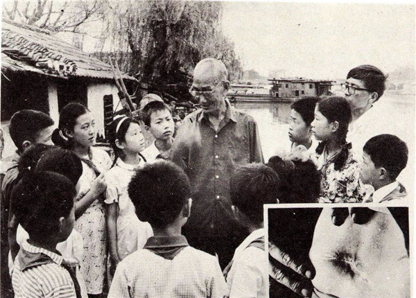 南京大屠杀幸存者伍长德,右下图为他被日军刺伤的刀疤
