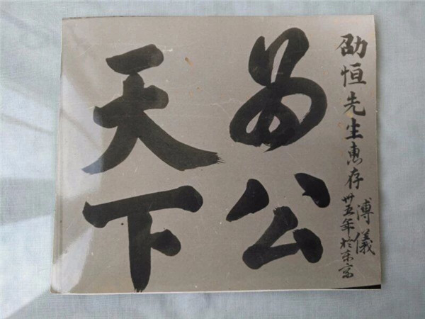 频繁的接触,裘劭恒和溥仪渐渐熟悉起来,谈话也随意多了。溥仪闲暇时喜欢书法,见裘劭恒经常来访,却没有礼物相送,有些过意不去。裘劭恒笑说,你一定要送我什么的话,就拿书桌上写好的字送给我好了。裘劭恒随手拿了两张,一张写着“天下为公”,一张则是由“克己复礼、正心修身”8个字组成的古代斗邪的人形字幅。溥仪在字幅上写了“劭恒先生惠存”并落款,送给裘劭恒。