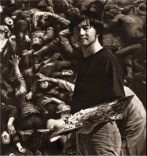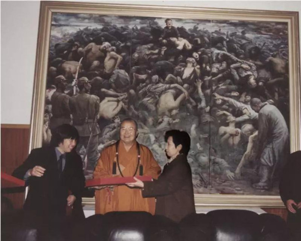 1992年,李自健在刚完成的《屠·生·佛——南京大屠杀》巨幅油画前