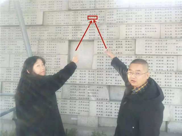 魏绍民的孙女魏冬梅(左)与孙女婿王庆(右)在爷爷名字前